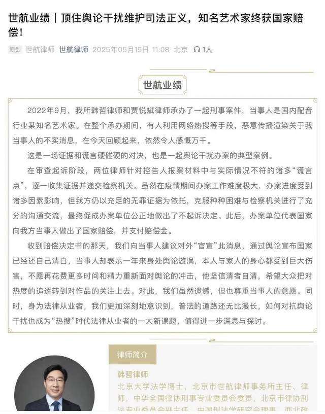 即使在2023年6月姜广涛发了一条微博表示已经复工,但他身上的“法制咖”舆论和污名仍然如影随形。直到今年5月15日,负责姜广涛的“北京世航律师事务所”业绩推文意外曝光,随后律所发布声明,厘清事件始末。