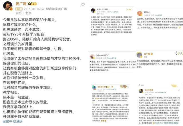 事情不止一件。5月31日,光合积木的一大批CV合约到期,集体道别,姜广涛发了一条微博,回溯配音道路上和学生们、伙伴们的相伴之路,同时给予他们祝福。
