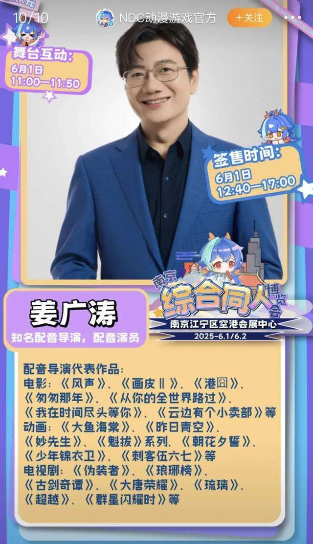 市场也仍然拥抱着这位始终站在一线的配音演员。在中断的一年里,有很多正在推进的项目被中断,但无论是甲方还是听众仍在等待姜广涛回归,先前中断的部分角色被重新拾起,此外,广播剧、动画、影视剧、电影、游戏等都有新的配音角色产出。同时从2024年开始,由他担任配音导演的作品不下10部。