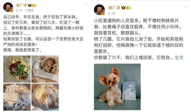 与网络上风浪不息、喧嚣不止的状态相对的,是他显得“一成不变”的微博,大多数时候他会在微博上分享日常碎片,有狗,有下厨的照片,也有散步的随手一拍,小部分是工作的营业博,显得平静又简单。