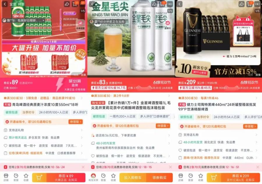 惊蛰研究所在网购平台搜索发现,普通工业啤酒的定价为每500毫升3.5元-10元,新中式茶啤的定价为每升10元-20元,传统精良由于规格和品牌差异明显,换算成每升容量的定价为20元-100元。