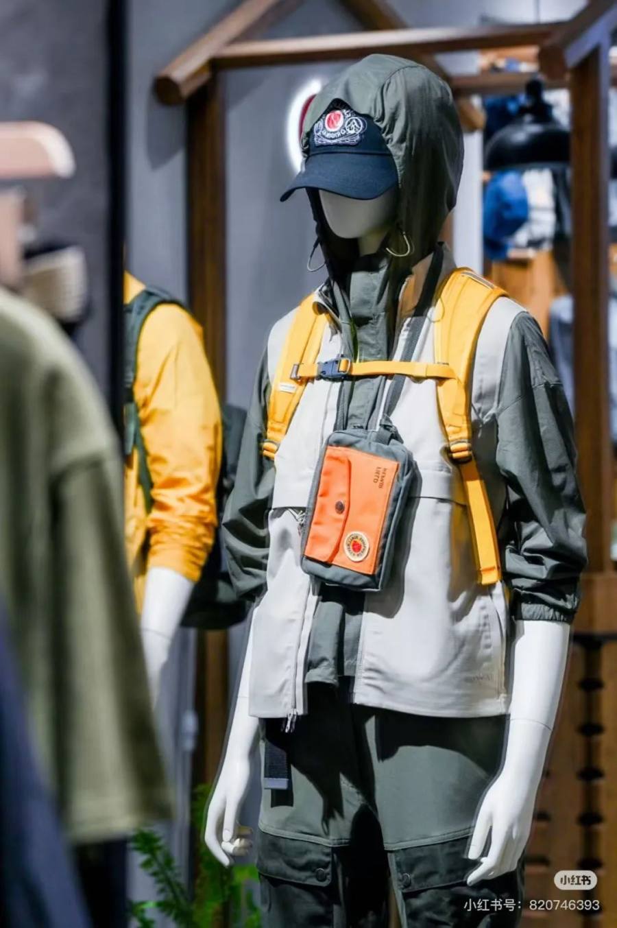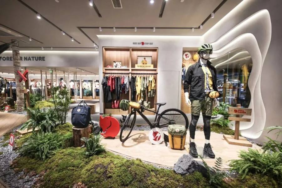 平均每月新开一家品牌综合店,至今全国各大高端商圈已开50多家门店。门店装饰灵感源于北极狐瑞典徒步线路的沿途景观,原木隔断、砂石铺路、苔藓、蕨类植物“长”在店里,KANKEN的展示区已经被放在侧面,进门显眼处是极具北极狐辨识度的上衣、裤子等装备。