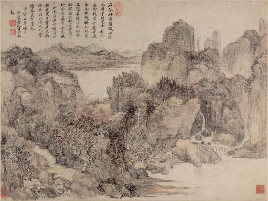 题跋: 石谷此图虽仿山樵而用笔措思全以右丞为宗,故风骨高奇,迪出山樵规格之外。春晚过娄,携以见际,余初欲留之,知其意颇自珍,不忍遽夺。每为怅怅然。余时方苦嗽,得此饱玩累日,霍然失病所在,始知昔人檄愈头风,良不虚也。 庚戌谷雨后一日。西庐老人王时敏题。