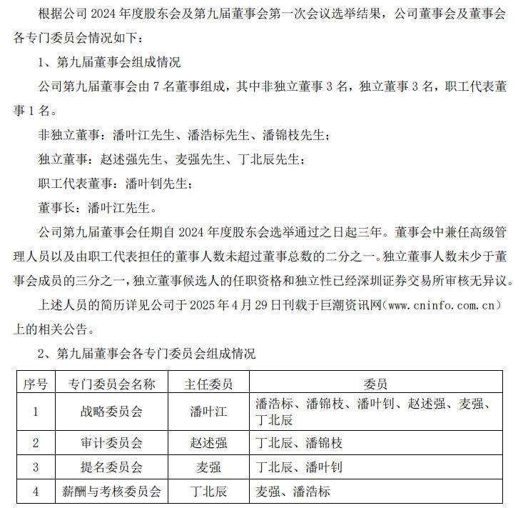 根据华帝股份最新的董事会换届选举公告,当前华帝董事会共有7位董事,其中非独立董事3名均是潘姓,包括潘叶江、潘浩标、潘锦枝;此外,职工代表董事是董事长潘叶江的兄弟潘叶钊,潘浩标之女潘楚欣是华帝股份董事会秘书。