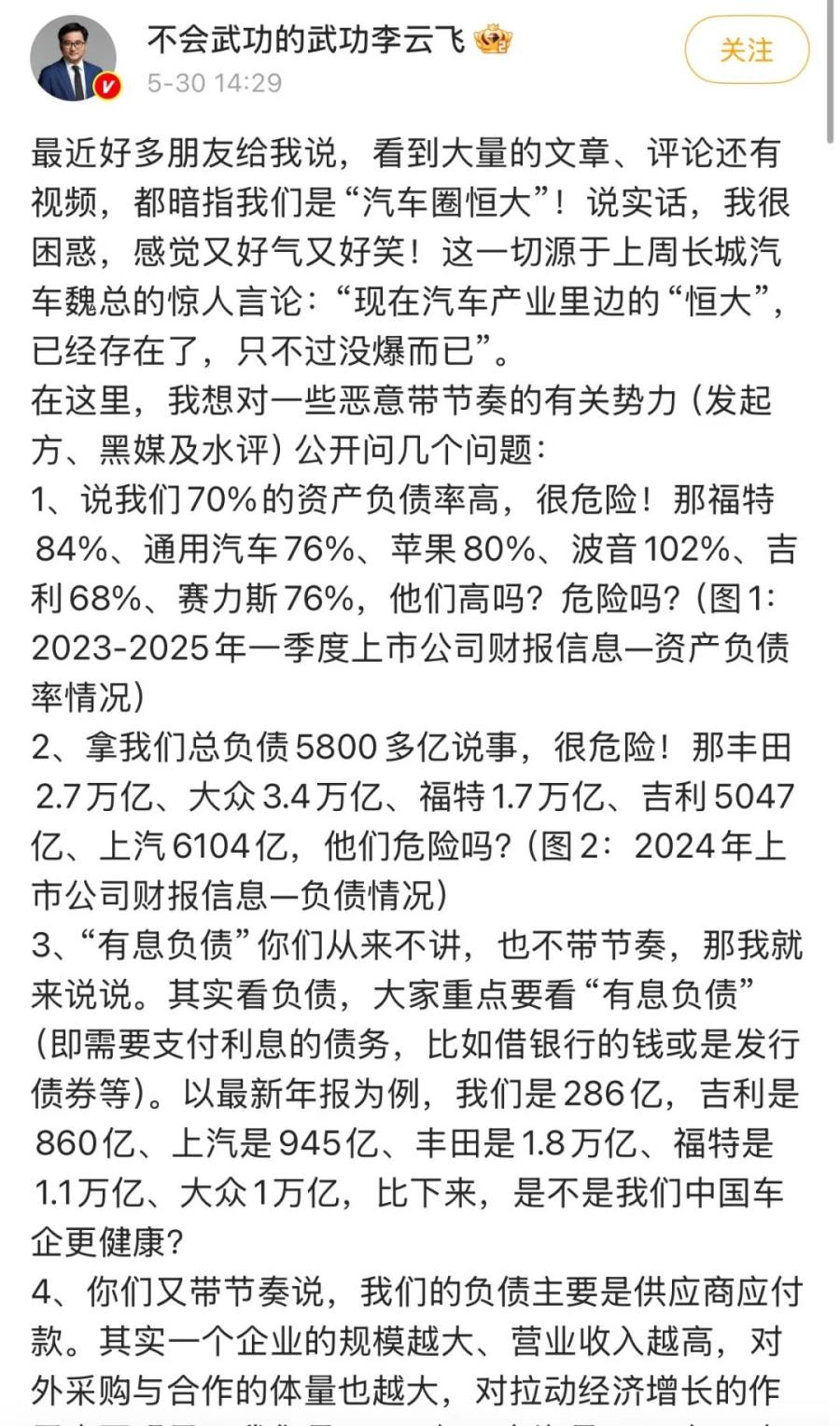 5月30日晚,比亚迪品牌及公关处总经理李云飞在微博正面回应“汽车圈恒大”言论,并要求“对一些恶意带节奏的有关势力公开问几个问题”。随后,他从资产负债率、付款周期等多个层面提出反驳,并暗讽长城汽车新能源转型失利。