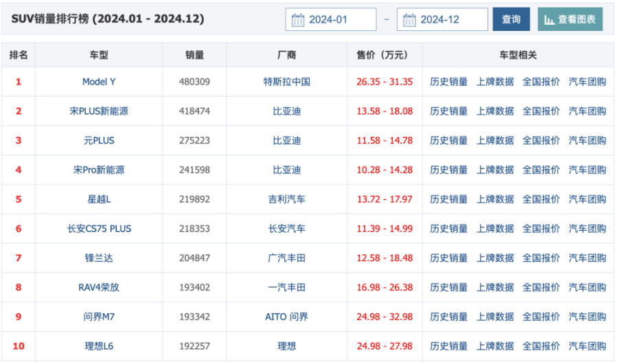 据车主之家数据,2024年上半年的SUV市场,比亚迪宋PLUS、宋Pro、元PLUS包揽前四名中的三席,合计销量超90万,而曾经的一代神车哈弗H6仅以超13万销量排在第24位。