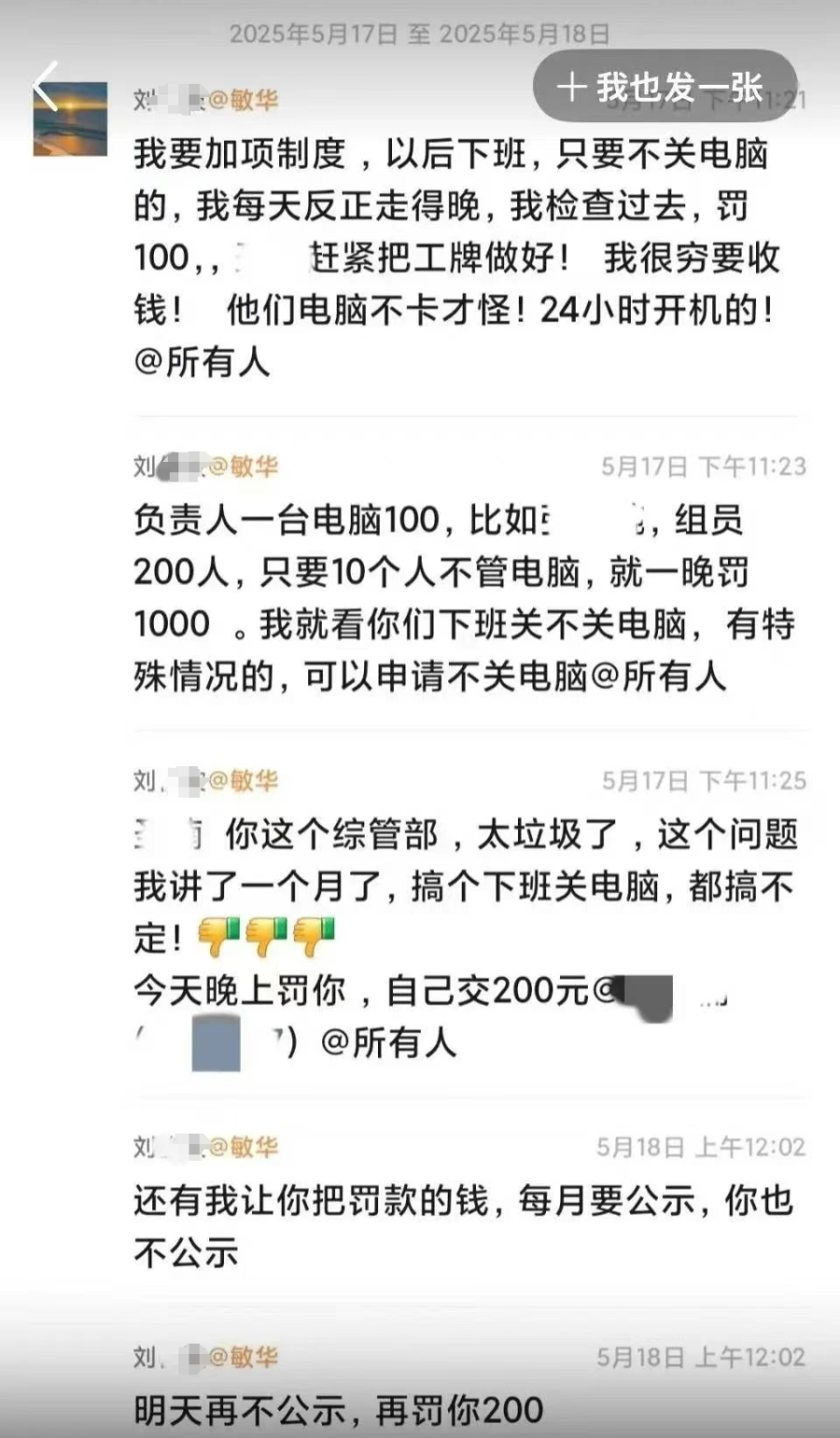 根据用户提供的聊天截图显示,今年5月,一位姓刘的高管在工作群中发文指出,有员工“上班不在工位”,有人去上厕所,有人“照镜子”,还有人以各种“奇怪理由”离开岗位,并表示:“被我查到打游戏的,直接开除!吃东西的,罚领导2000元,主管1000元,次主管500元。”他还强调,对于“无事不在岗位”的情况,超过三次以上的员工将面临月度工资减少2000元的处罚。此外,刘某还追加规定称:“下班不关电脑罚100元。”