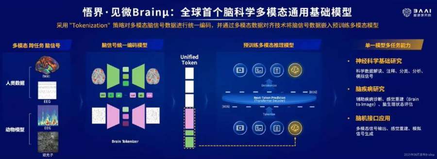 “悟界”大模型系列中的见微Brainμ就脱胎于Emu3的“骨架”中。基于Emu3的底层架构,智源研究院成功将fMRI、EEG、双光子等神经科学与脑医学相关的脑信号统一token化,并完成了100万单位的神经信号预训练。