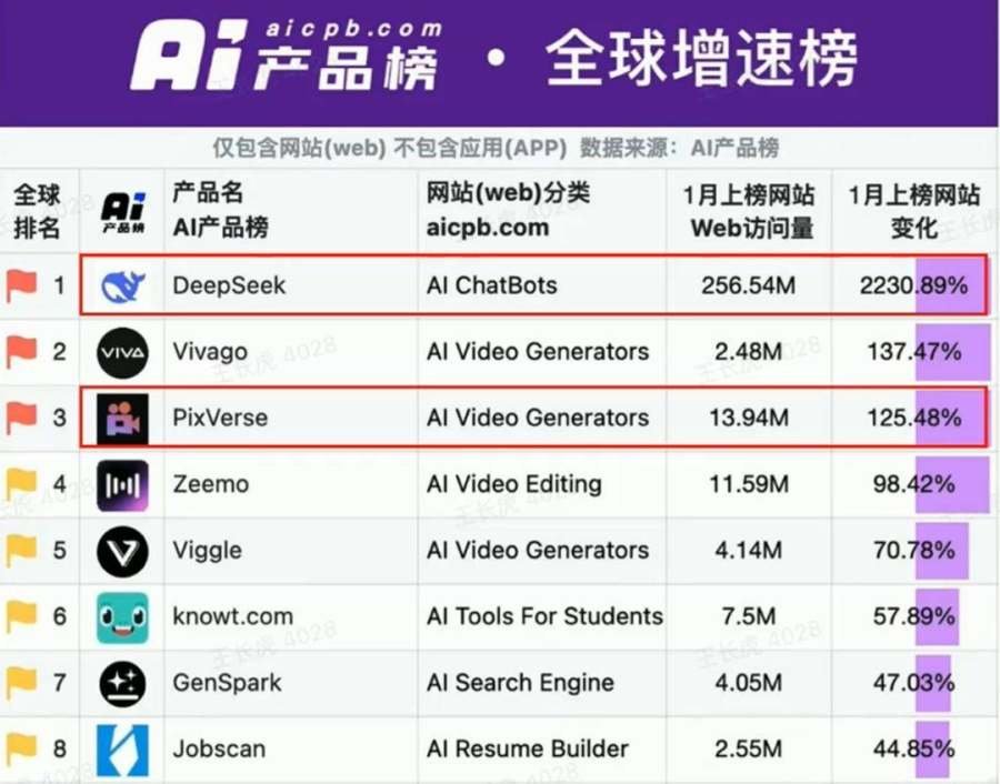 据王长虎分享,通过特效视频模版在抖音以及国内外各大社交媒体上的传播,PixVerse打响了知名度。当月,在中国产品出海增速榜,PixVerse排在第二名,访问量提升80%。他还分享了一个印象深刻的数据——今年4月,超过PixVerse MAU增长的AI产品只有DeepSeek。