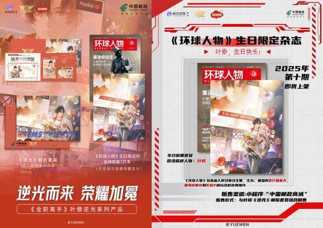 瑞士国家旅游局官微发文为叶修庆生,官宣叶修为“瑞士旅游探路员”,推出了《全职高手》瑞士出征特别企划,开启为期一个月的旅游主题打卡活动。还有推出《全职高手》带你游瑞士定制旅游路线的飞猪旅行APP,推出叶修生日主题邮票、专程推进叶修庆生专题图登上《环球人物》杂志封底的中国邮政……