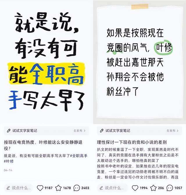 小说连载时,电竞仍属于较为小众赛道,甚至不乏书迷因为小说才对职业电竞联赛产生兴趣,2018年前后,电竞行业借助体育化进程和入亚等大事件,在国内迎来了全面爆发,也带动不少兴趣粉丝反向寻找电竞主题网文,阅读《全职高手》。随着电竞经济的全面爆发,小说中更理想主义的战队塑造和更纯粹的热爱驱动叙事也与真实电竞产生区别,近两年,社媒上也流行起大量关于《全职高手》世界与现实电竞对比玩梗的衍生讨论,足见这一题材的持续关注度。