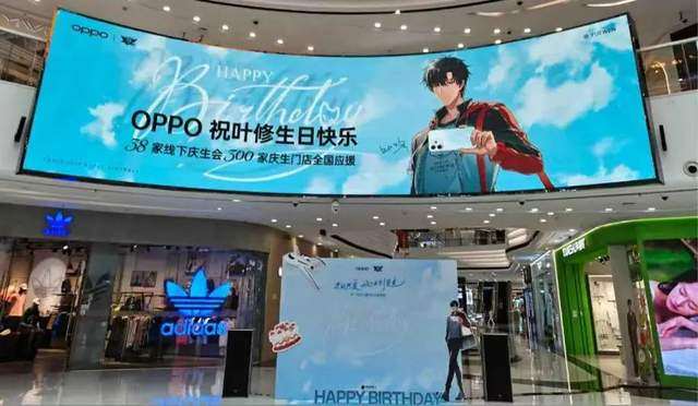 联名品牌OPPO在全国各地打造了38家叶修庆生主题店,并追加300家门店投放生日海报,打造了杭州生日专场和品牌联名痛车,并承包了新浪微博首页开屏、京东首页、京东搜索词条置顶等生贺联名品广告,给足了OPPO Reno14系列官方实况影像大使叶修排面;