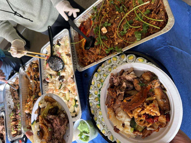 除了烤羊腿、烤鸡翅、烤虾串外,基金会为大家准备了14种菜品。除了饮料,还有男生喜欢的啤酒,不限量,管够。为了让200人很快拿到食品,基金会组织了分菜小组,分成两队分发,高效率赢得了好评。