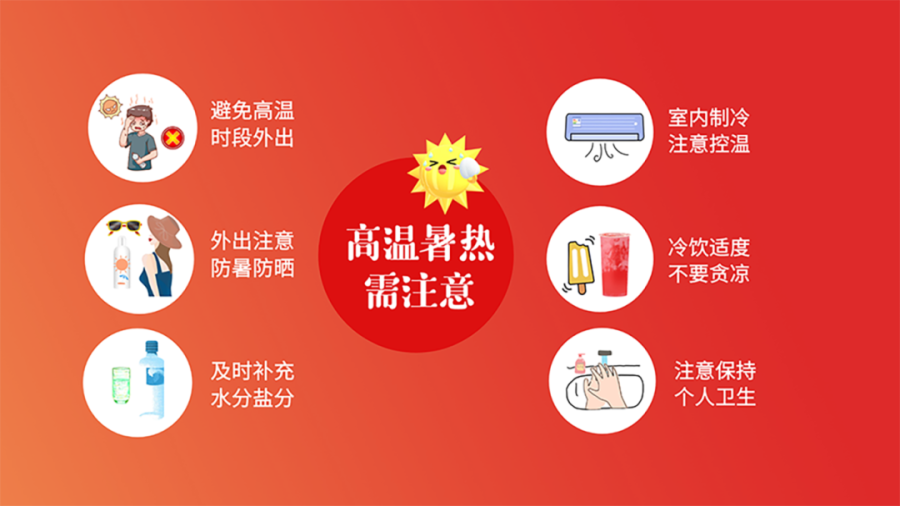 高温来势汹汹,提醒公众一定要做好防暑降温工作,尤其是中午前后,尽量避免高强度的户外活动,谨防中暑和热射病的发生。