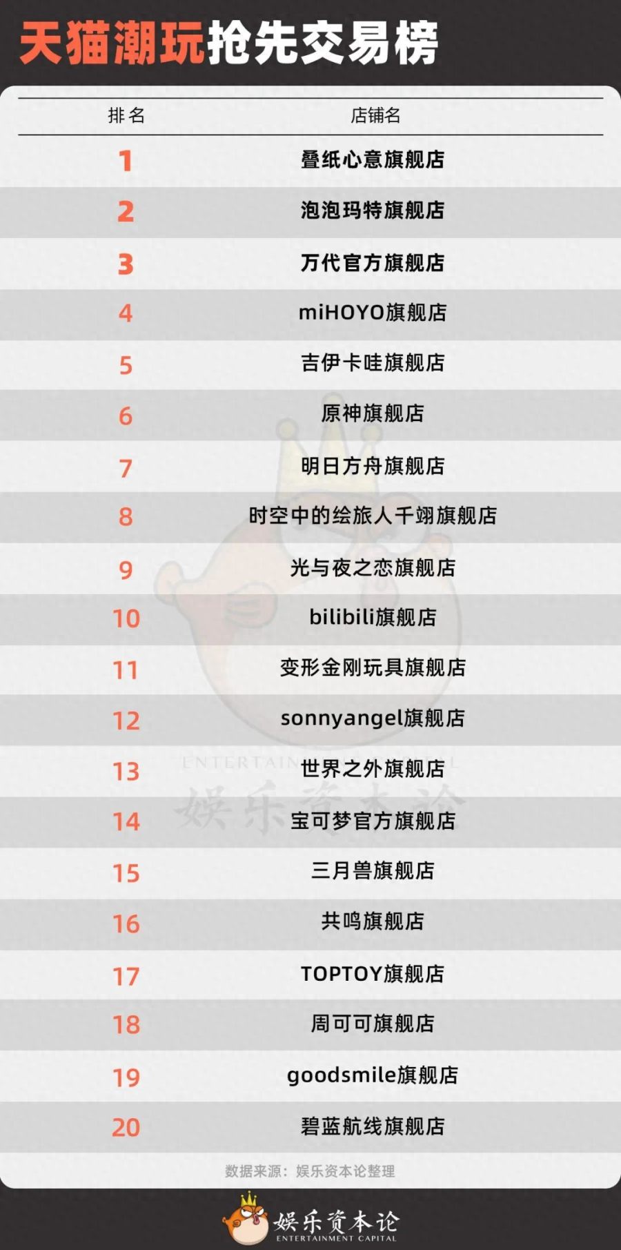 6月初,天猫官方公布的 “天猫潮玩 618 抢先成交榜”就已经让很多人意外,站上成交榜榜首的,是叠纸科技的官方旗舰店叠纸心意,第二名才是泡泡玛特。