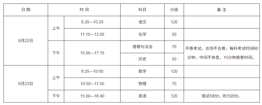 今年中招考试时间为6月22日—23日。实行全省统一命题、统一试卷、统一考试时间。各地按照国家和省有关要求,统一制订本辖区的考试招生工作方案,负责考务、阅卷和录取工作。