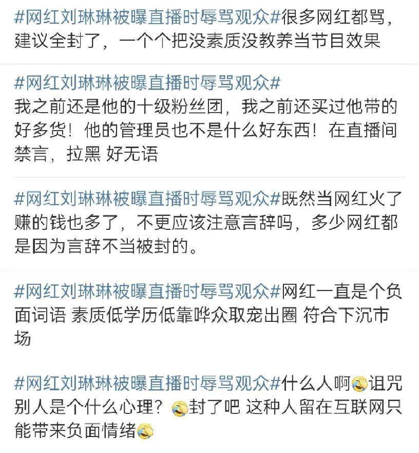 在此前的多次直播过程中,刘琳琳曾多次言语失当,频繁在直播间置顶网友负面评论,并对评论者进行人身攻击,言辞极其粗俗,例如辱骂对方“你妈妈去世了,你爷爷奶奶也都死了”。