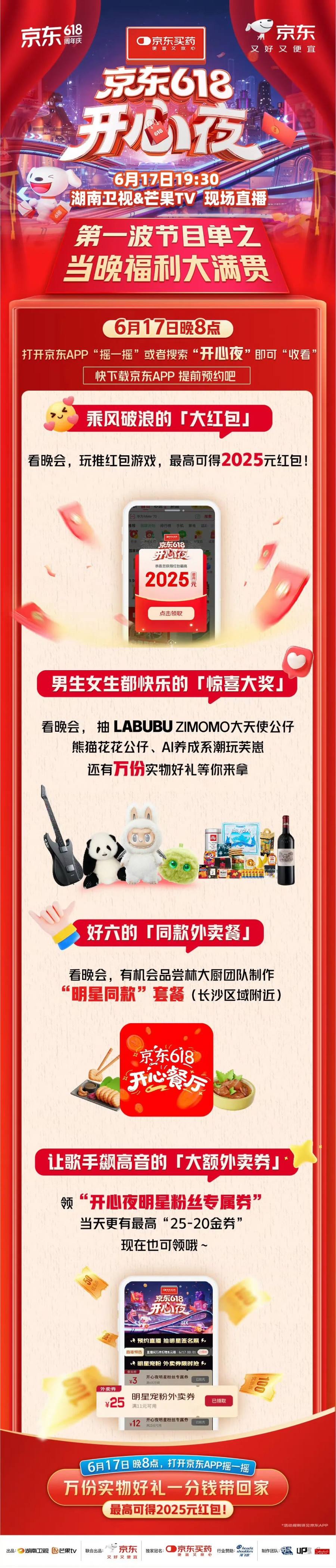 再将视角转回《京东618开心夜》,除了预约阶段送出的晚会免费入场券、明星独家视频、明星签名照、京东外卖百亿补贴券等福利,晚会当日,观众参与推红包互动,最高可得2025元,更有机会瓜分囊括了LABUBU ZIMOMO大天使公仔、熊猫花花公仔等在内的万份实物好礼。