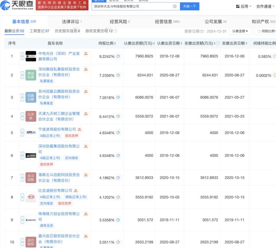 天眼查App信息显示,华大北斗成立于2016年12月,位于广东省深圳市。目前,该公司的注册资本约8.6亿元,法定代表人为孙中亮,主要股东包括中电光谷等。