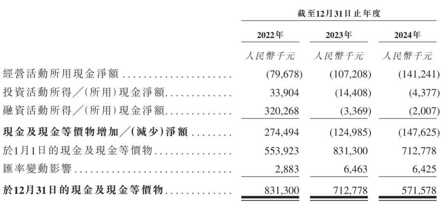目前,华大北斗经营活动所用的现金流量净额持续处于流出状态,报告期内分别为-7967.8万元、-1.07亿元和-1.41亿元。截至2024年末,该公司在手的现金及现金等价物约5.72亿元,较2023年同期的7.13亿元减少19.8%。