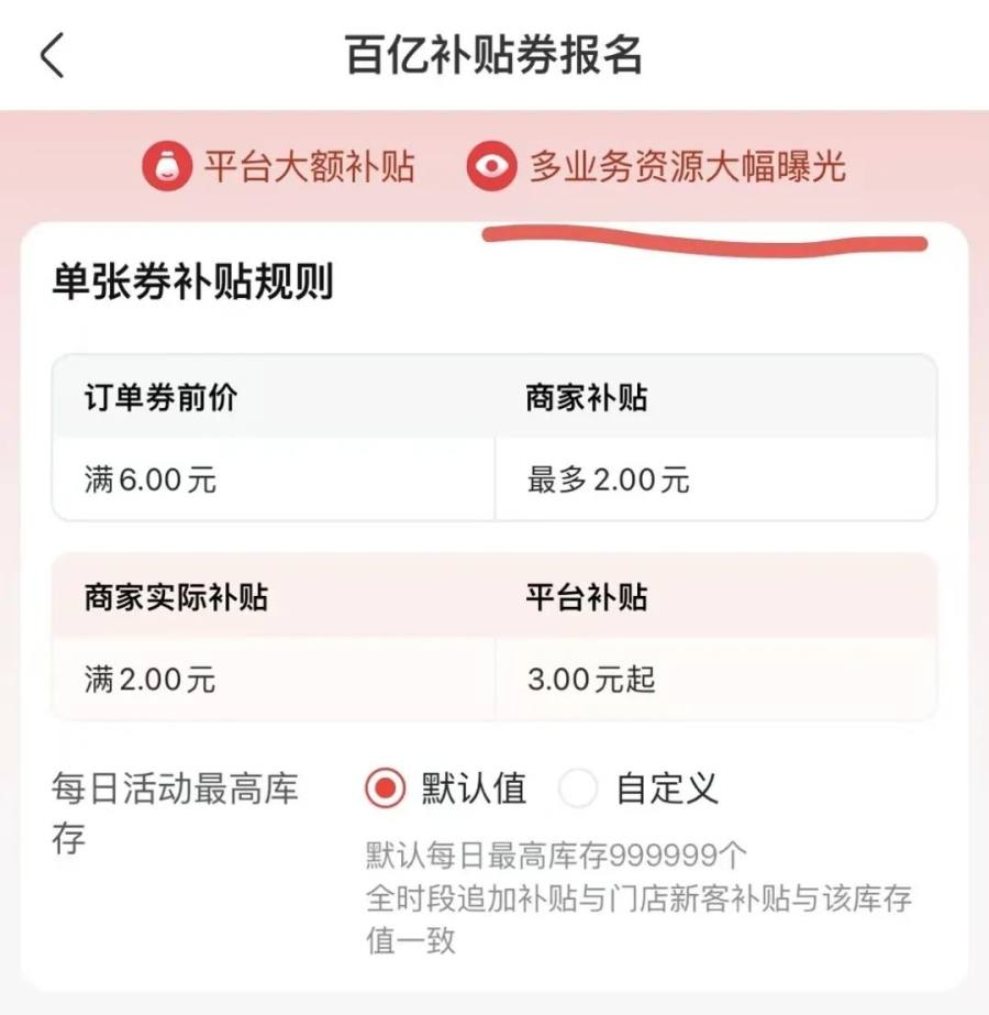 蓓蓓解释,和美团外卖一样,如果不参加平台主推的优惠活动,“ 那你的店铺就会因为优惠减少而流量下滑,进店量也会随之减少。这个路径和美团是一样的,可以理解,美团一旦膨胀神券关闭也会大幅下滑。” 她向知危展示了京东百亿补贴券的报名页面,“ 平台大额补贴 ”、“ 多业务资源大幅曝光 ” 醒目地展示在页面最上方。开店多年,熟悉外卖平台活动节奏的蓓蓓表示,“ 这种活动就是属于 ‘ 流量活动 ’。”