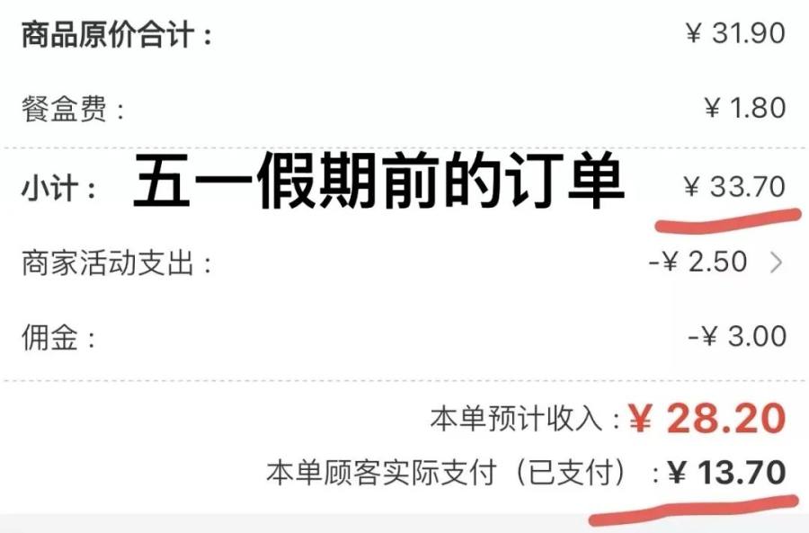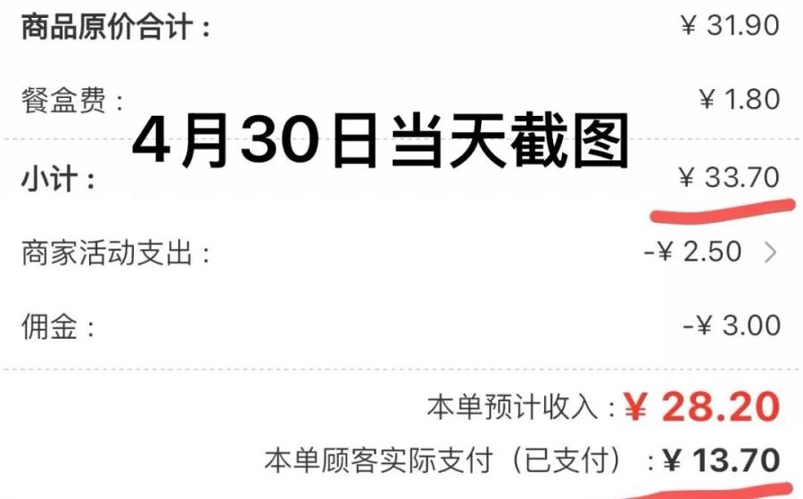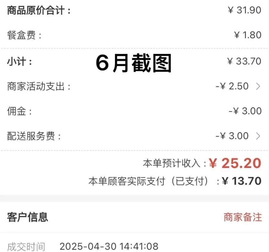 而且,蓓蓓还发现,4 月 30 日的一笔外卖订单,她当天截的图上只扣了 3 块钱佣金和商家活动支出 2.5 元,本单预计收入 28.2 元,6 月份她再倒回去看当时的订单,同样的页面显示多扣除了一项 3 元钱的配送服务费,而本单预计收入也赫然变成 25.2 元。