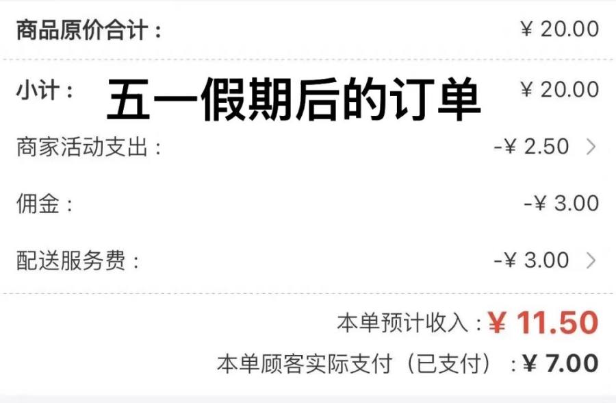 “ 但我发现五一假期结束之后,我每笔订单在已经扣除了名为 ‘ 佣金 ’ 的 3 元钱的基础上,又多扣了一个 3 元钱,这个钱叫做 ‘ 配送服务费 ’。” 蓓蓓说。