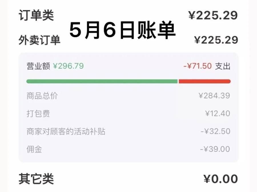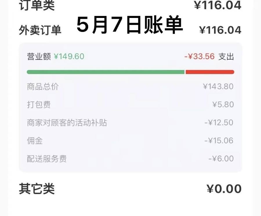 蓓蓓发现,5 月 6 日商家端日账单中的扣除项,还只有 “ 商家对顾客的活动补贴 ” 和 “ 佣金 ” 两项,而 5 月 7 日开始,扣除项新增了一个 “ 配送服务费 ”。