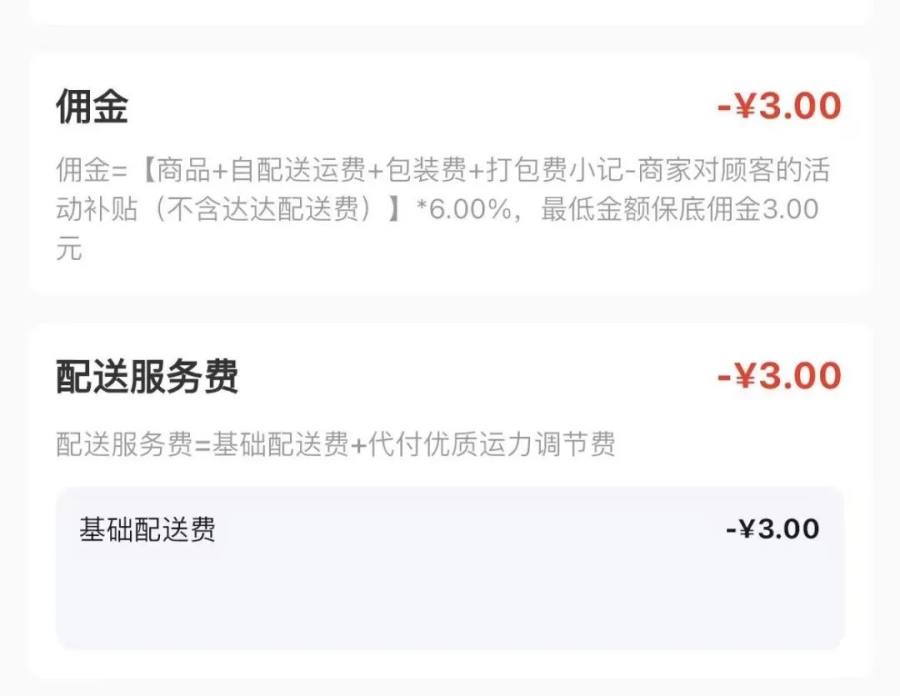 现在,平台后台说明上,对于 “ 佣金 ” 和 “ 配送服务费 ” 这两个 3 元扣除项的解释是,佣金系 6% 的扣点,配送服务费系基础配送费+代付优质运力调节费。
