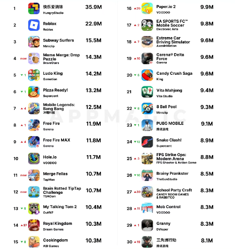 AppMagic发布的2025年5月全球手游下载排行榜中,有三分之一是休闲消除游戏,新上榜的《Meme Merge: Drop Puzzle》与《Merge Fellas》均为“三消”迭代来的“二合”游戏,且早在2023年11月便上线,一年半后竟再次翻红。