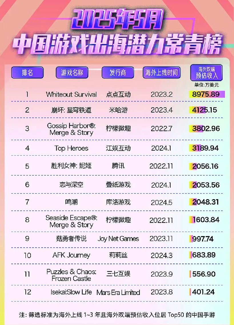 值得注意的是,柠檬微趣出海收入已经连续三个月力压一众大厂稳坐榜单Top5,成为手游厂商出海中的新贵。