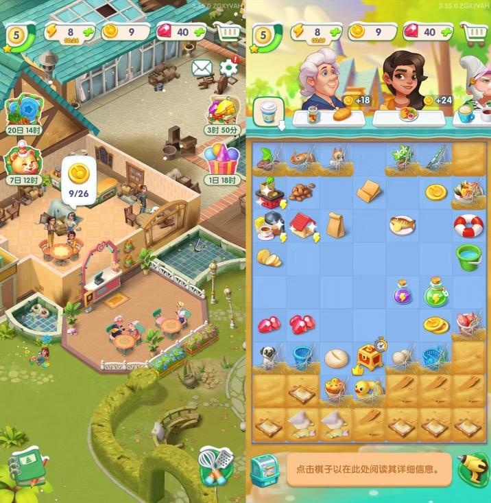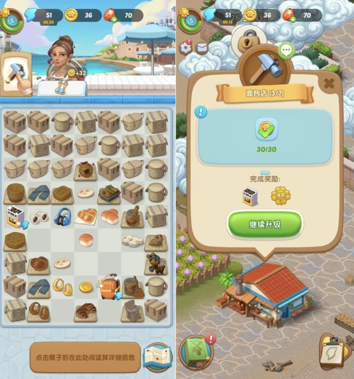这两款游戏玩法上汇聚了合成、家装和剧情三大核心要素。玩家需要消耗体力来合成材料,并根据顾客的需求制作对应的物品,以此获取金币奖励。随后,玩家可以利用获得的金币对建筑进行修缮升级,在提升环境与设施的同时,也逐步推进游戏的剧情发展。