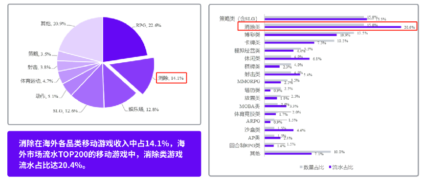 根据伽马数据,2024年消除类游戏在海外移动游戏各品类收入中占比达到14.1%。在海外市场流水TOP200的移动游戏中,策略类、消除类和博彩类在数量与收入方面均占据重要比重,其中消除类游戏的总收入占比更是高达20.6%,可以说已不容忽视。