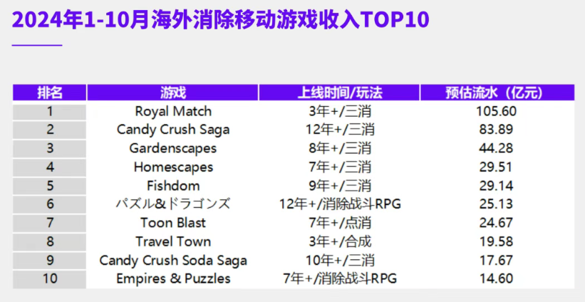 2024年1-10月海外消除移动游戏收入TOP10榜单显示,Dream Games旗下的《Royal Match》以约105.6亿元人民币的预估流水位居榜首。
