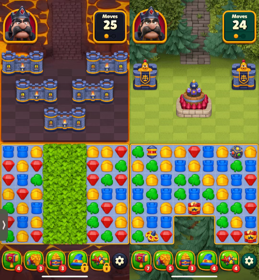 游戏还扩充了更为完整的人设背景,出场角色、关卡分类、棋盘元素都做了扩容,比如在炸弹、火箭等合成道具之外,设定了诸如泥巨人、水塔、护卫等消除棋盘元素,上限更高的游戏机制,使得游戏难度提高,玩家需要通过更精密的操作或是更深度的付费才能过关。