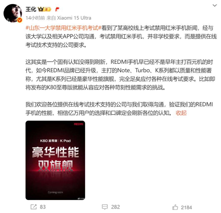 近日,有网友反映山东科技大学2025年本科综合评价招生面试规定禁止考生使用红米系列手机参加线上考试。针对此事,小米集团公关负责人王化通过微博回应称“公众认知需要更新”。6月16日上午,校方发表声明表示该限制并非学校政策,承诺将要求第三方考试平台优化服务。