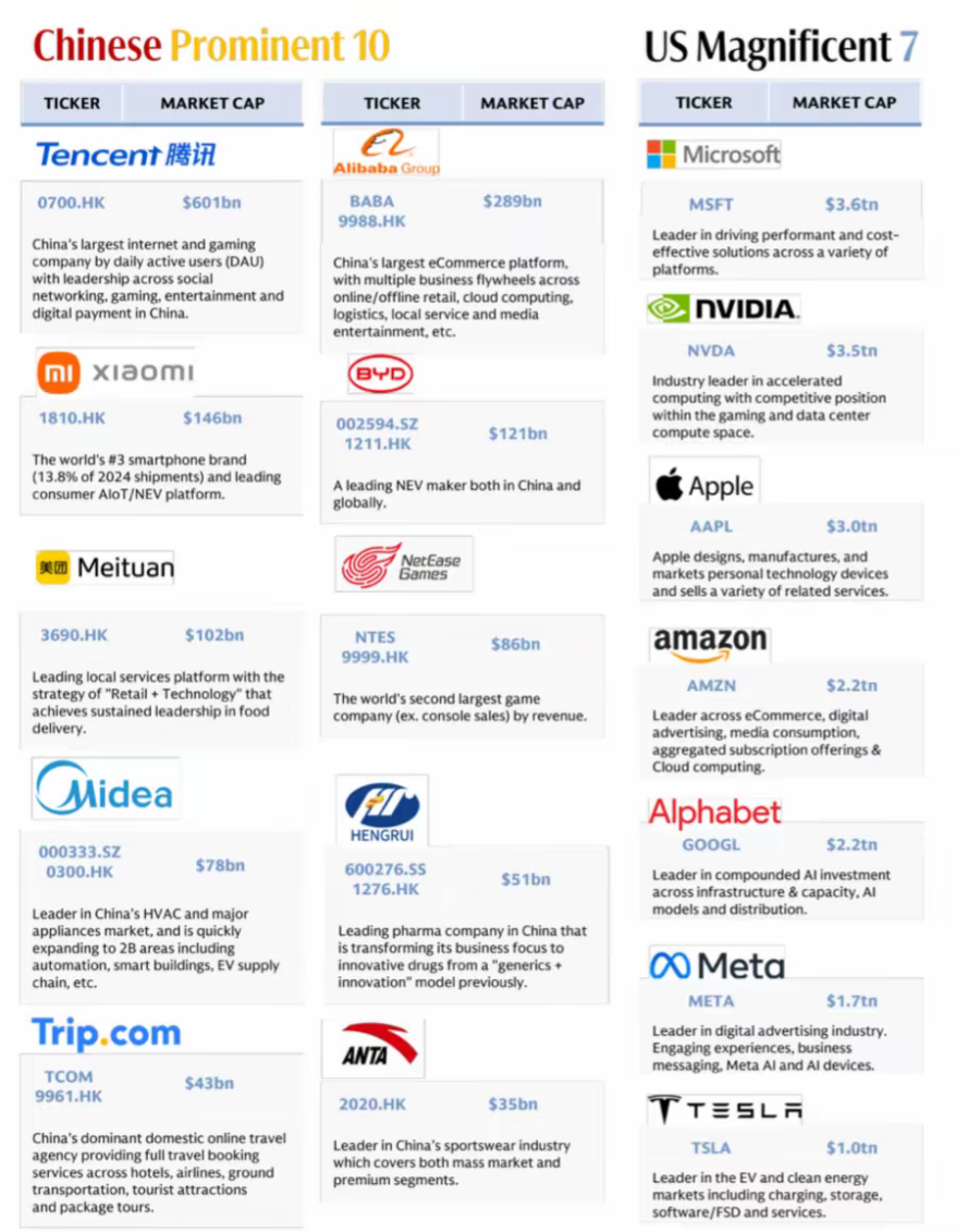据澎湃新闻消息,6月15日,高盛发布《中国民营企业回归》系列报告,推出“中国民营十巨头”(Chinese Prominent 10)概念,将腾讯、阿里、小米、比亚迪、美团、网易、美的、恒瑞医药、携程、安踏十家民企龙头,对标主导美股的“七姐妹”(Magnificent 7)。
