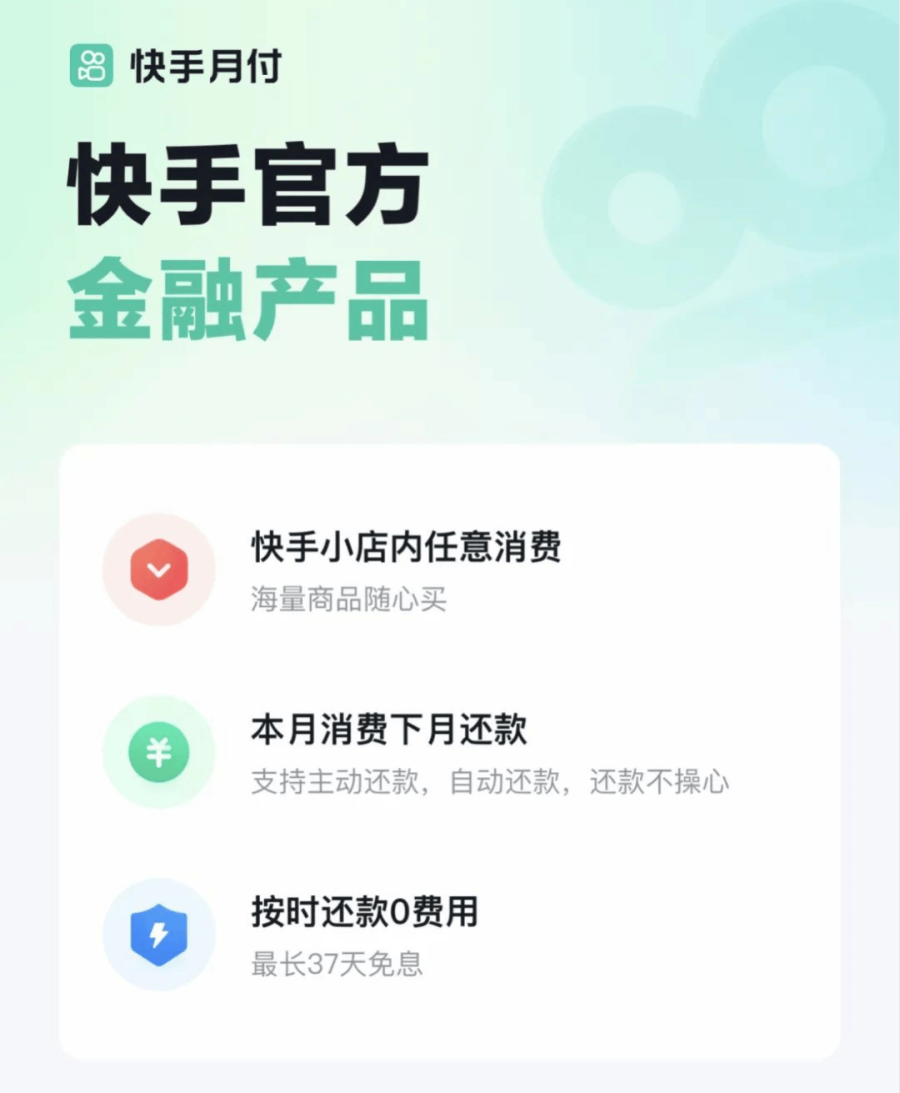 快手月付正式上线,以37天免息期和仅限快手小店内使用的场景独占性,形成差异化竞争。产品瞄准电商消费金融的细分赛道,试图通过自有信用支付工具打通 "内容种草—直播带货—金融服务" 的闭环。