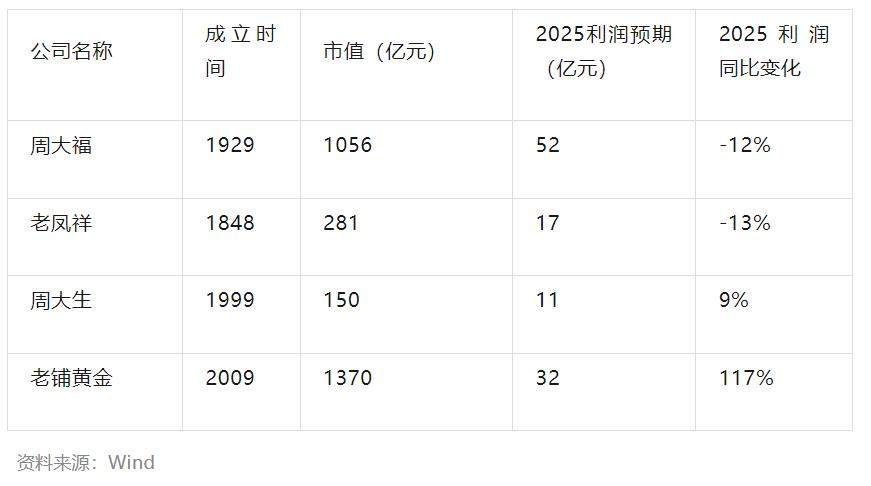 而老品牌们还深陷在高金价中。作为成立最晚的品牌,市场一致预期老铺黄金2025年利润将翻倍,其他品牌则是面临着不小的下滑压力。老铺黄金的最新市值接近1400亿元,这个最新品牌反超百年老店登顶黄金珠宝行业市值第一。