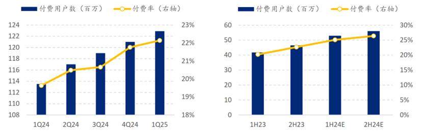 图:腾讯音乐(左)和网易云音乐(右)付费用户数和付费率 资料来源:浦银国际