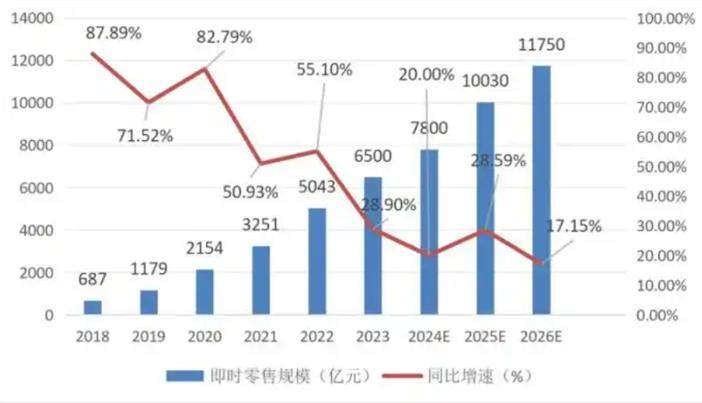 另一个正在发生巨变的是即时零售。从履约场景来看,即时零售是以3-5 公里范围本地供给为支撑,与30分钟至1小时的即时配送结合,形成的高时效性线上零售业态。