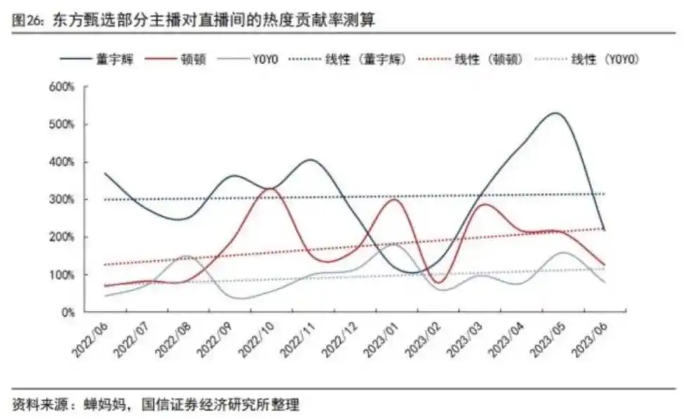 国信证券分析称,顿顿的热度贡献率由2022年6月直播间爆火之初的40%—70%提升至2023年6月的100%—200%的水平,热度贡献率仅次于董宇辉的300%。但“美丽生活一哥”顿顿并没有大范围出圈,成为东方甄选的下一个现象级主播。