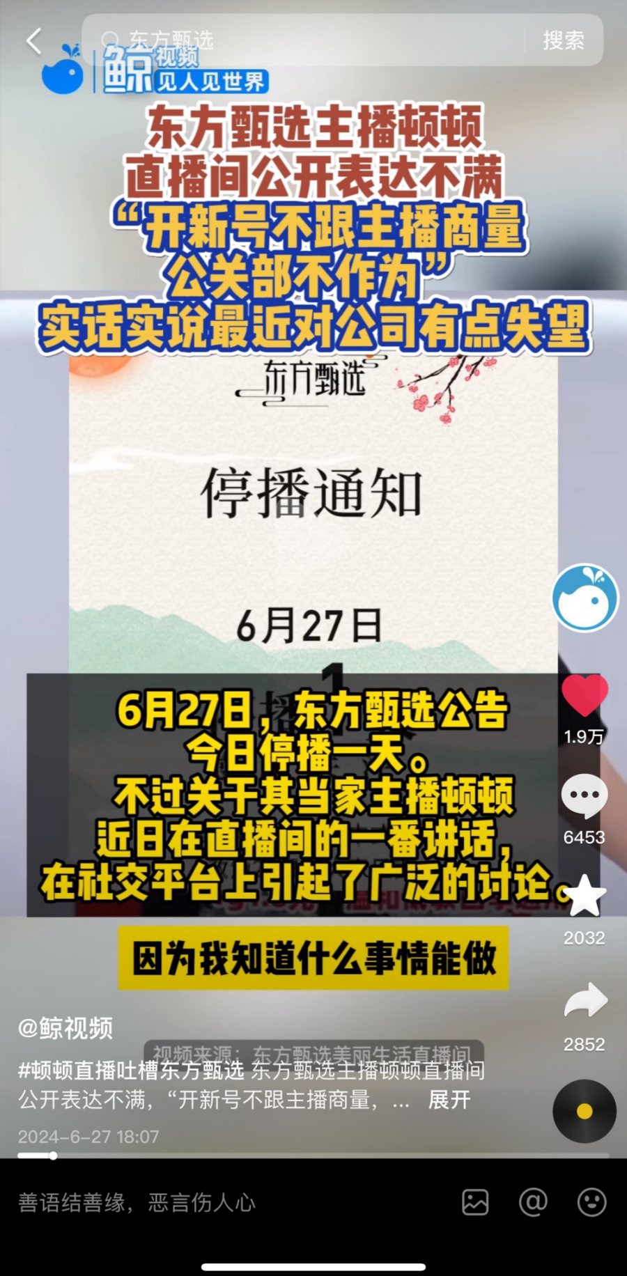 今年2月,顿顿在直播间透露,近期有一家卫视邀请他参加综艺节目但未被公司允许,法务还推掉了他的商务合作。东方小孙在当时回应网友质疑称,公司鼓励任何一个主播的发展,但不希望历史上出现过的风波再继续困扰公司的小伙伴。此事一度引发热议,有观点将其解读为“东方甄选不允许再出现第二个董宇辉”。