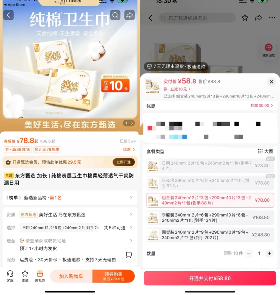6月16日,东方甄选宣布上线首款自营卫生巾产品。该产品率先在东方甄选App面向会员开售,单片定价不足1元,上线14小时销量即突破30万包。第三方数据平台显示,仅在抖音单平台上,该卫生巾产品目前已卖出1000-2500万元。