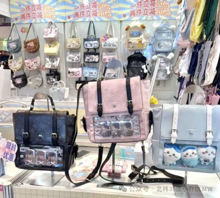2024年8月,小咩开始在大上海城摆摊售卖痛包(“痛包”源自日本二次元文化,指用透明包体展示动漫角色徽章、挂件的装饰包。通过密集排列心爱角色周边表达喜好,兼具收藏展示与日常搭配功能)。工作日,小咩是写字楼里的白领,周末则化身“手作娘”,售卖自制的痛包配件、假发和串珠饰品。