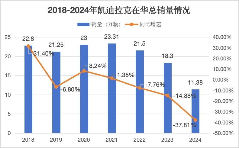然而,好景不长。三年前,凯迪拉克的销量增长势头戛然而止,转而步入下行通道。2022年,其销量为21.5万辆,同比出现下滑;2023年,销量进一步萎缩至18.3万辆,这一数字甚至回到了2017年的水平;而到了2024年,凯迪拉克的全年累计销量仅为11.38万辆,同比下滑幅度超过37.8%,标志着该品牌已陷入连续三年遭遇销量下滑的困境。