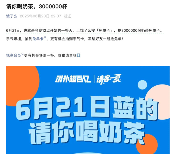 饿了么与整个阿里生态体系的打通仍在继续。6月20日晚,在饿了么宣布“免单卡”活动的同时,淘宝闪购联合支付宝官宣,连续10天推出共计10亿元餐补。这意味着饿了么+淘宝闪购的日订单量仍将继续攀升。