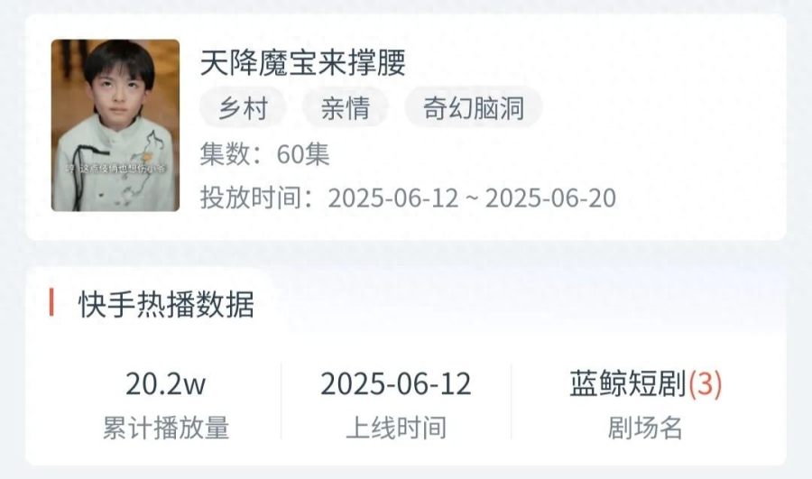 本周聚焦两部佳作:与之前萌宝短剧《寒门小状元》《郡主十岁:我把纨绔爹养成皇帝了》纯粹“小人说大人话”的特色不同,《天降萌宝来撑腰》用哪吒造型与海报吸引观众,以 “萌皮魔骨” 的反套路人设打破萌宝剧定式,将仙魔斗争嵌入现代职场商战,用 “法术护妈”的奇幻设定融入亲情主线。当高考题材短剧陷入“热度昙花一现”或“内容违规下架”的困境时,这部《觉醒当天,我当上全国状元》则把高考热点与豪门恩怨深度绑定,以 “出狱即状元”的极端设定重塑大女主逆袭逻辑,连环反转让高考题材在传统爽剧框架焕发新生。前者上线两天登热力榜 Top10,后者开播即霸榜且抖音原生端播放量破 3 亿,印证了 “经典元素 + 微创新”的叙事策略,正成为短剧在红海中突围的核心密码。