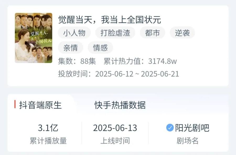 《觉醒当天,我当上全国状元》一共88集,上线一天进入热力榜榜单第1位,连续霸榜两天。截止6月21号,该剧的热力值达3174.8w,抖音端原声累计播放量3.1亿,快手热播累计播放量为1.2亿,长期位于热力值榜单TOP30。