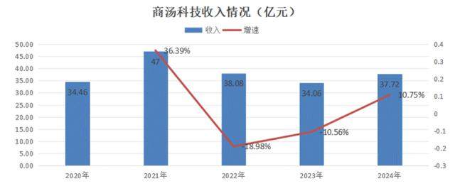 2024年,商汤科技实现37.72亿元营业收入,同比增长10.75%。从收入体量上看,虽然24年商汤的收入还未回到2022年水平,但这已经是商汤科技近3年来首次收入正增长,也算释放了一个不错的信号——完成AI1.0到AI2.0的安全着陆。